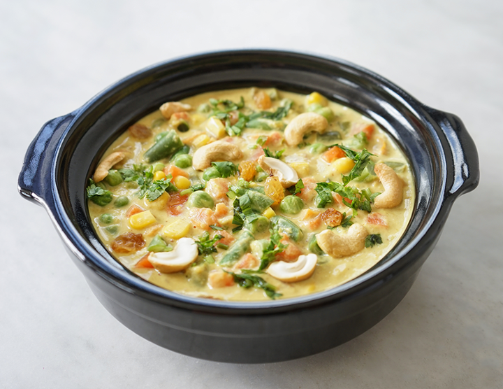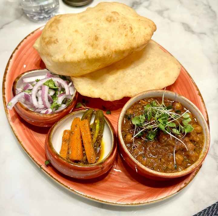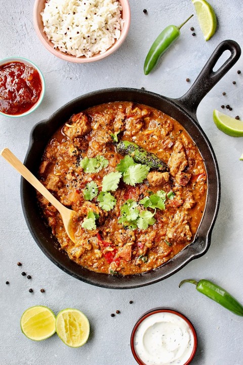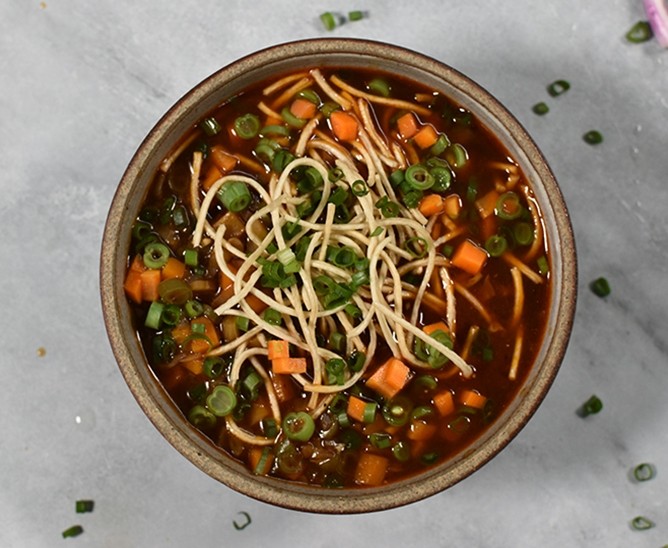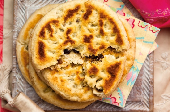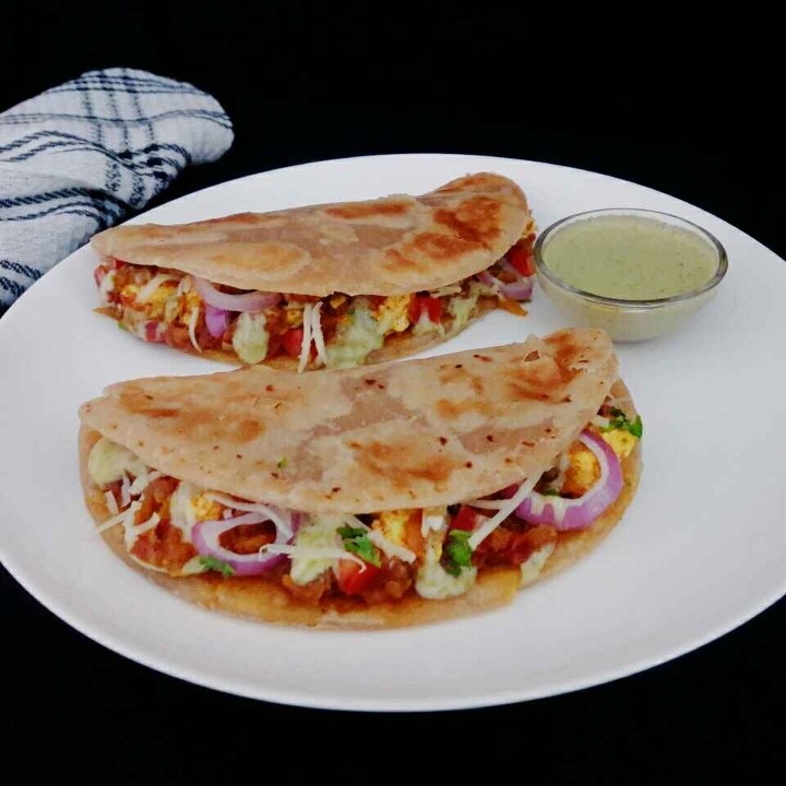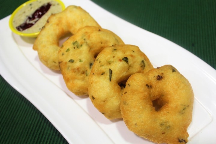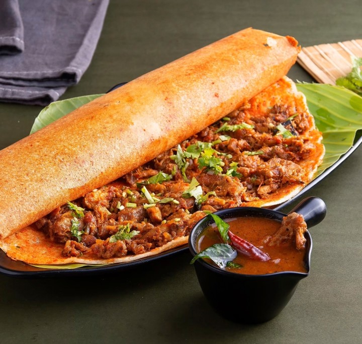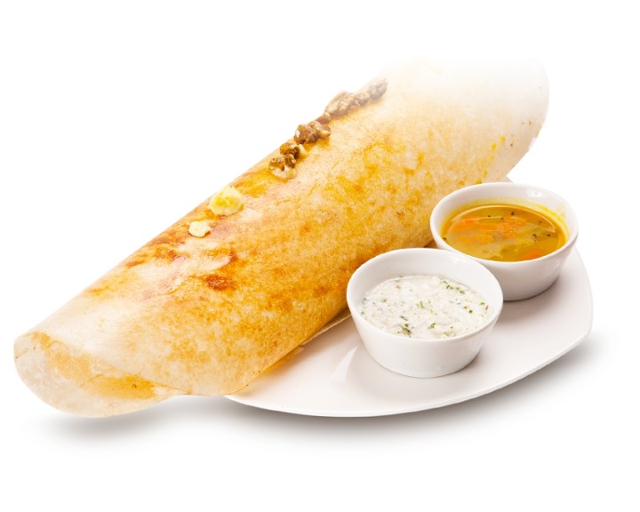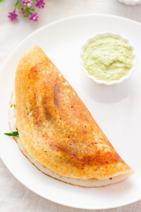 Crisp aromatic pancake made with fermented rice & lentil batter stuffed with potato masala & served with coconut & tomato chutney