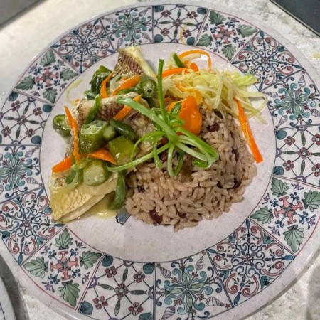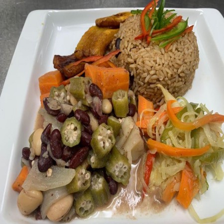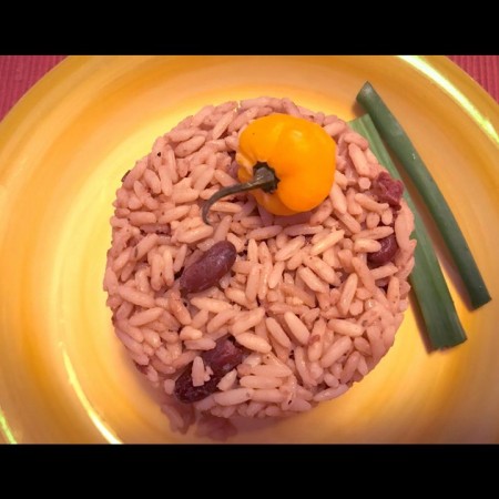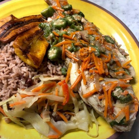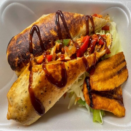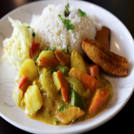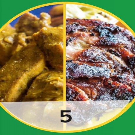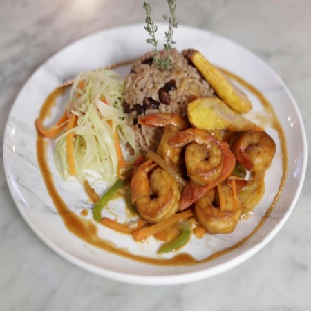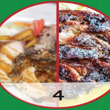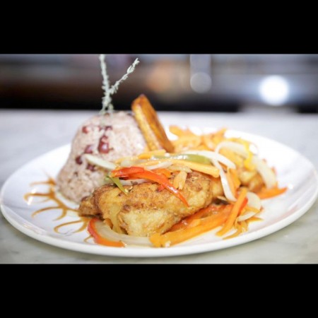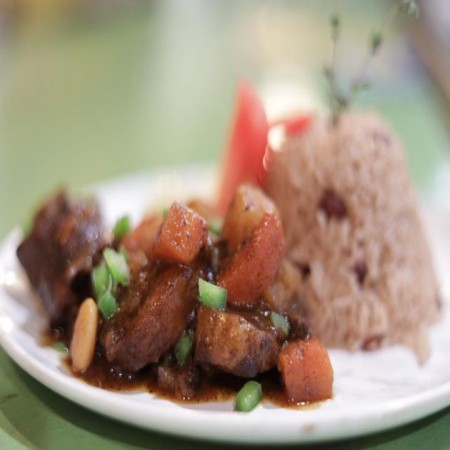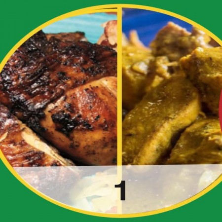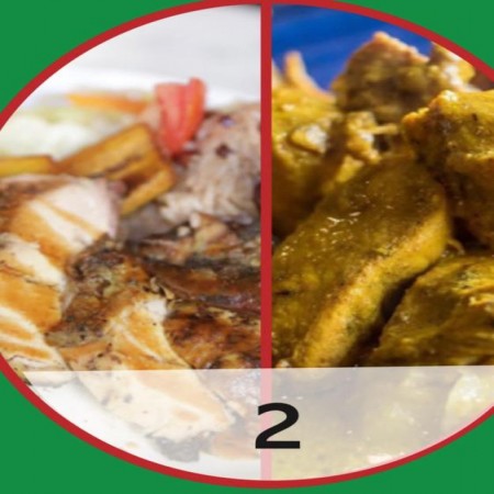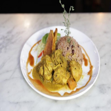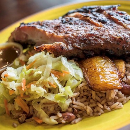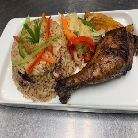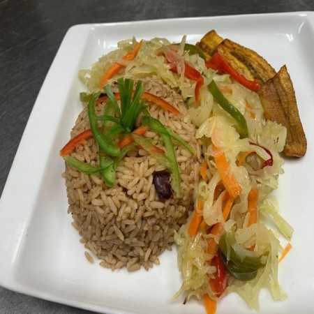 Includes rice & peas. Garnished with steamed cabbage & plantain.