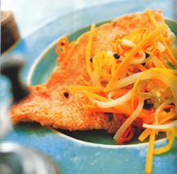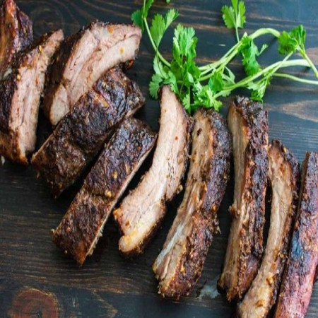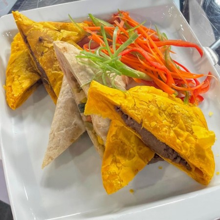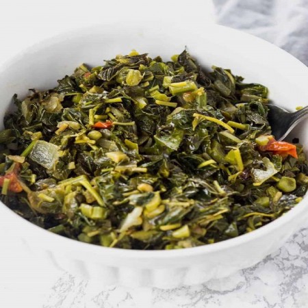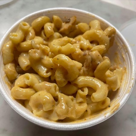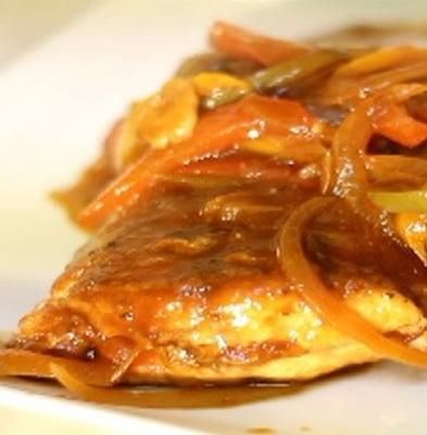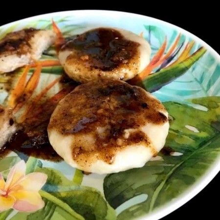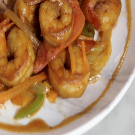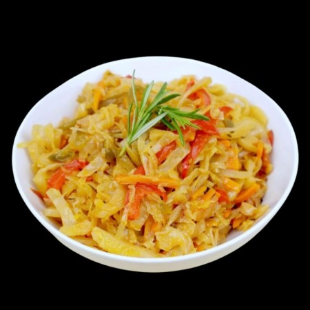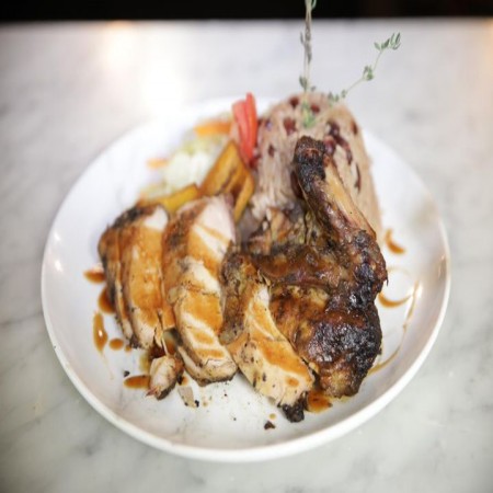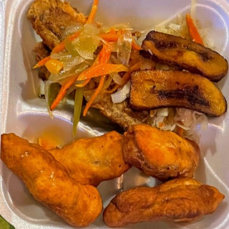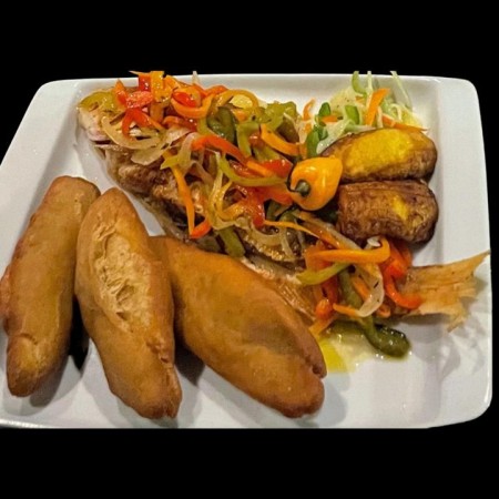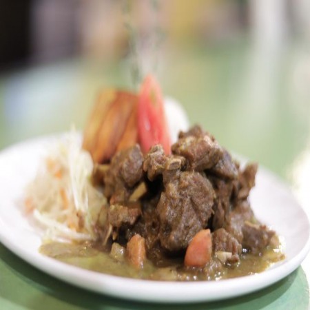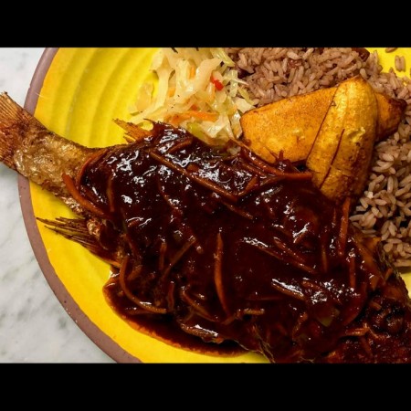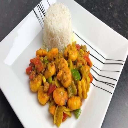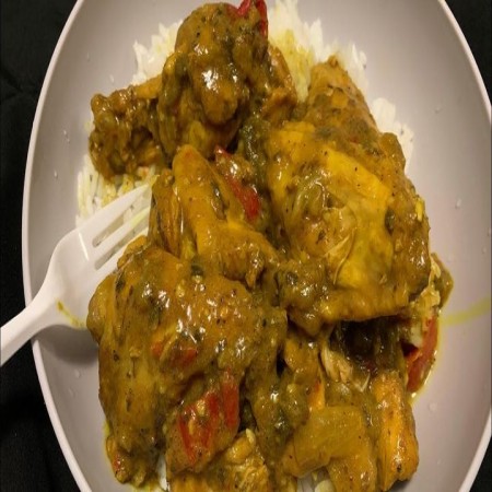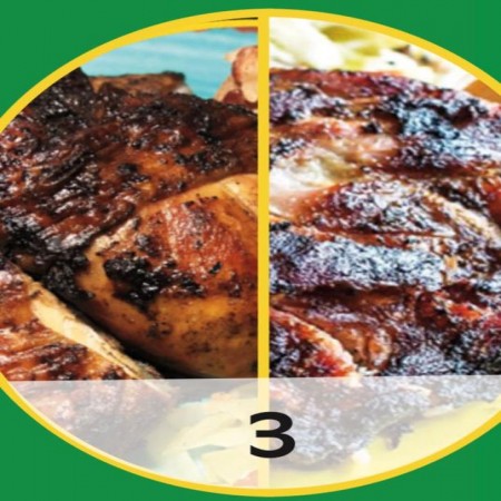 Includes rice & peas. Garnished with steamed cabbage & plantain.